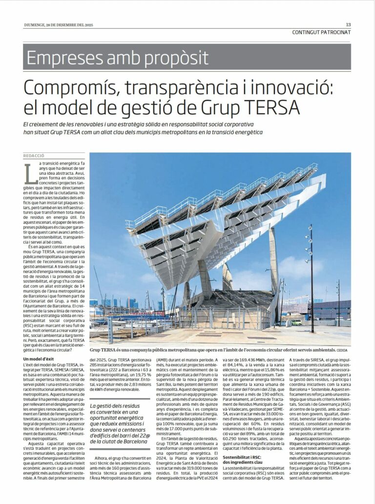 El dossier inclou també el reportatge sobre Grup TERSA, empresa membre de Respon.cat, que exemplifica com el propòsit es pot traduir en polítiques públiques concretes. El seu model integra generació d’energia renovable, gestió de residus, educació ambiental i criteris de bon govern, mostrant com la sostenibilitat, quan s’incorpora de manera estructural, esdevé una palanca real de transformació social i territorial.Llegiu-ne més→