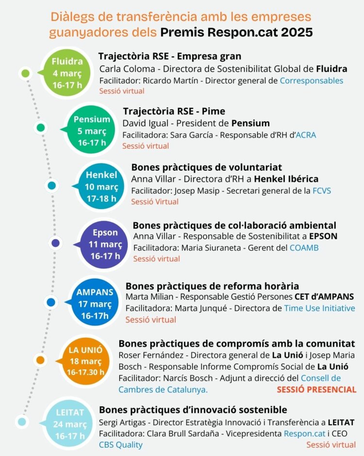 Els Diàlegs de Transferència són una sèrie de converses estructurades (majoritàriament virtuals, amb una sessió presencial) on empreses guardonades pels Premis Respon.cat 2025 exposen les seves experiències i reptes en matèria de RSE. Cada sessió se centra en un àmbit essencial del compromís social —des de la trajectòria de RSE fins a pràctiques específiques com el voluntariat corporatiu, la col·laboració ambiental o la reforma horària— oferint una combinació d’inspiració, evidències i debats pràctics entre professionals.