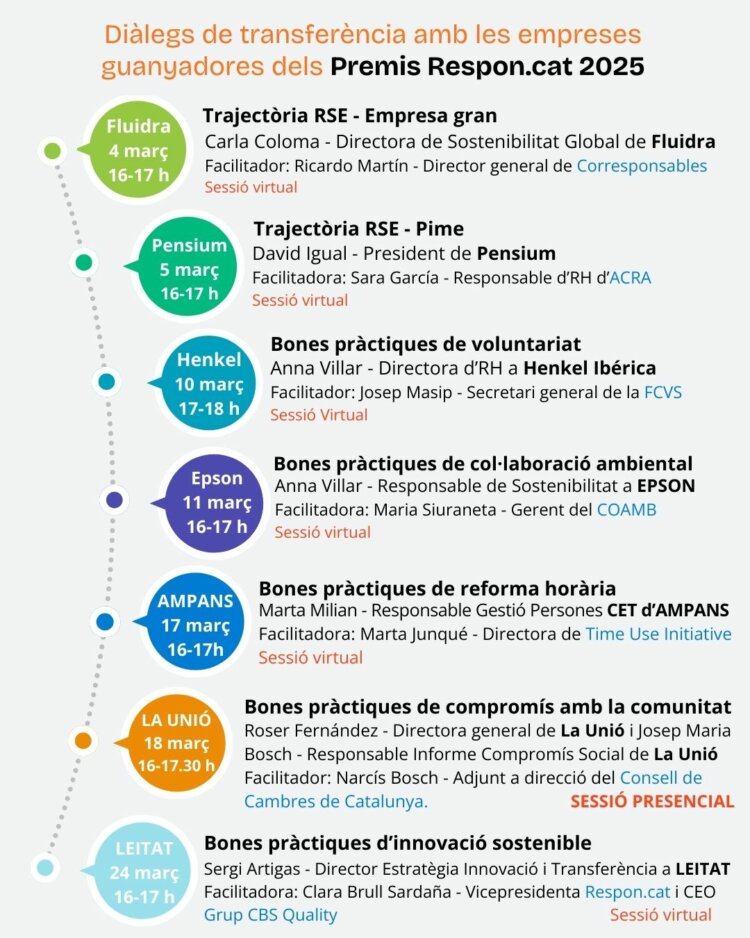 Com cada any, Respon.cat organitza un seguit de diàlegs de transferència amb les empreses guanyadores dels premis Respon.cat, que van tenir lloc el 27 de gener. L’objectiu d’aquestes jornades és aprendre el valor generat gràcies a la Responsabilitat Social Empresarial (RSE) i allò que en retorna.
