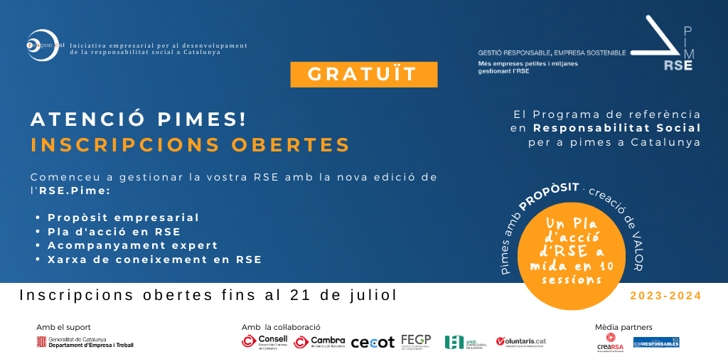 - Fins al 21 juliol segona tanda per inscriure’s a l’RSE.Pime, un programa d’acompanyament per fer un salt qualitatiu en la gestió de la vostra RSE.
