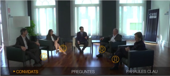Es tracta d'un magnífic material audiovisual, de 50 minuts, que els participants del Màster podran visualitzar segons menú, de manera que podran seleccionar les diferents intervencions o accedir a altres continguts. Tota una aposta de la UOC per desenvolupar tècniques avançades per als seus cursos de més interès.