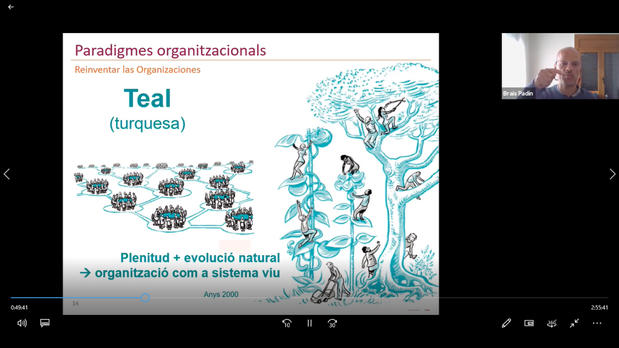 Brais Padin va introduir el tema fent un recorregut pels diferents paradigmes organitzacionals al llarg de la història, i el canvi des de les “empreses taronges”, filles de la revolució industrial, a les organitzacions “TEAL” (color turquesa) que són organitzacions que treballen per maximitzar el poder de cada persona perquè puguin desenvolupar el seu màxim potencial. Per la seva banda, Ma Carmen Olaya va compartir la seva experiència en incorporar aquest nou paradigma organitzatiu basat en la confiança i com els ha ajudat a millorar el potencial de cada persona.
