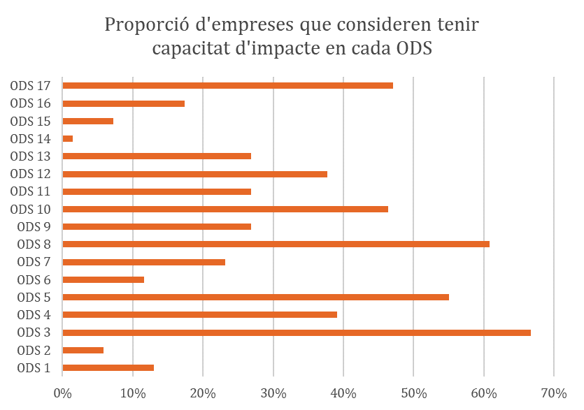 Una altra manera de llegir les dades és dir que l’ODS 13 es troba en vuitena posició (juntament amb els ODS 9 i 11), si endrecem els ODS segons la proporció d’empreses que diuen tenir-hi capacitat d’impacte.