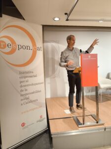 Joan Romero Circuns, director executiu d’ACCIÓ de la Generalitat de Catalunya, va comparar les empreses amb éssers vius, amb una personalitat i manera de ser singular, i amb capacitat per decidir com es relacionen amb el seu entorn. Va insistir que treballar amb RSE té un impacte final amb els resultats i números de l’empresa. “La competitivitat passa per tenir una bona estratègia d’empresa que reculli els valors de l’RSE”. A més, va apuntar que “el talent es mou i tria on treballar pels propòsits que tenen les companyies”. Va acabar exposant que Respon.cat, les Cambres de Comerç i la Generalitat de Catalunya fan costat a les pimes compromeses que vulguin marcar la diferència.