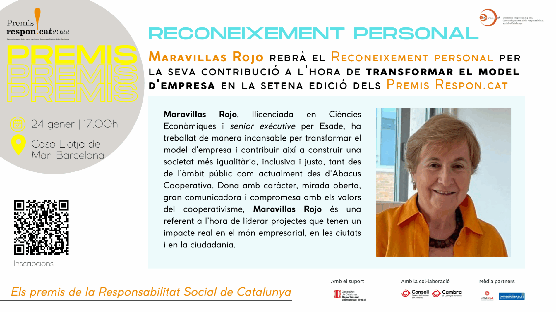 Pel que fa al reconeixement personal, el jurat l’ha volgut atorgar a la trajectòria de la Sra. Maravillas Rojo, que ha treballat de manera incansable per transformar el model d’empresa i contribuir així a construir una societat més igualitària, inclusiva i justa, tant des de l’àmbit públic estatal, com municipal a l’Ajuntament de Barcelona. Sara Berbel, psicòloga doctorada en psicologia social i especialista en polítiques d’igualtat d’oportunitats, lideratge femení i empresa, lliurarà aquest reconeixement.