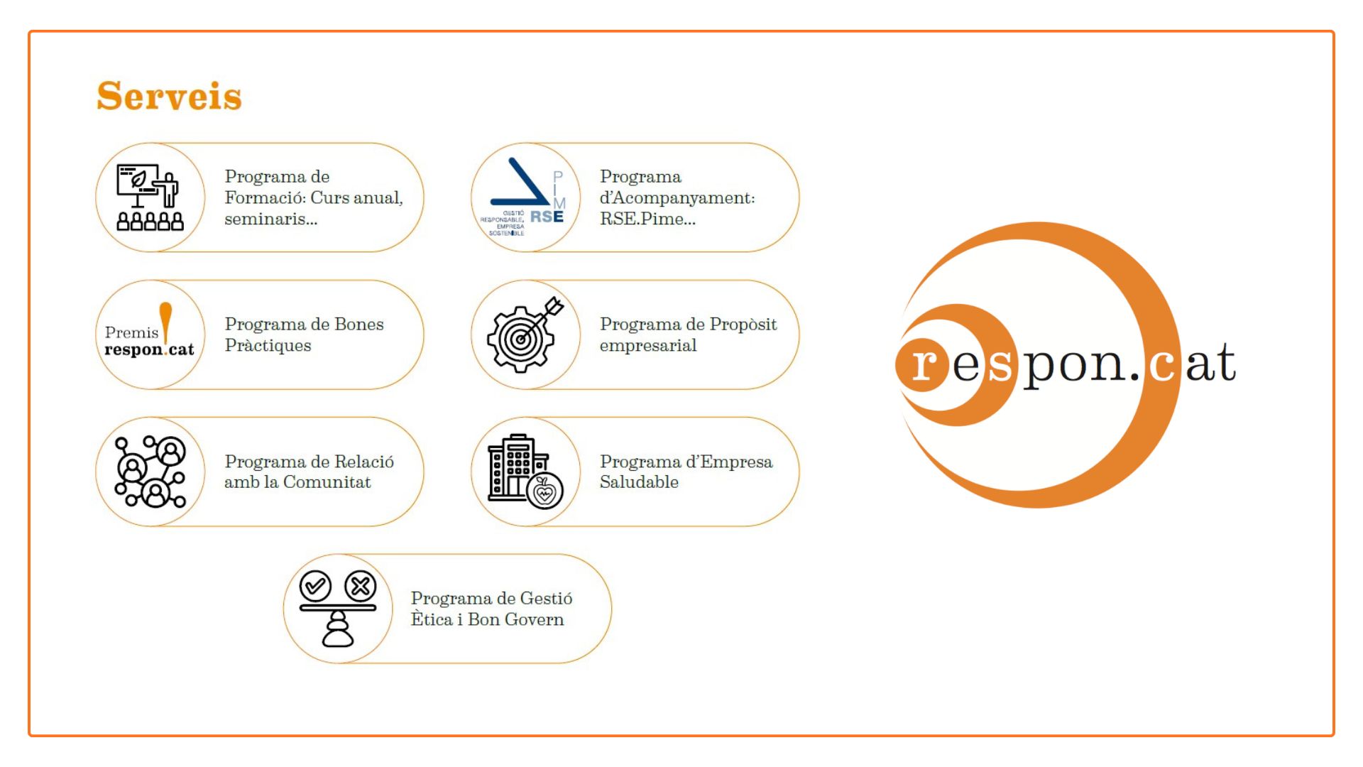 - Acompanyament: programa de suport a les empreses -pimes o grans- per facilitar la gestió de la seva RSE integrada al seu model d’empresa i estratègia.