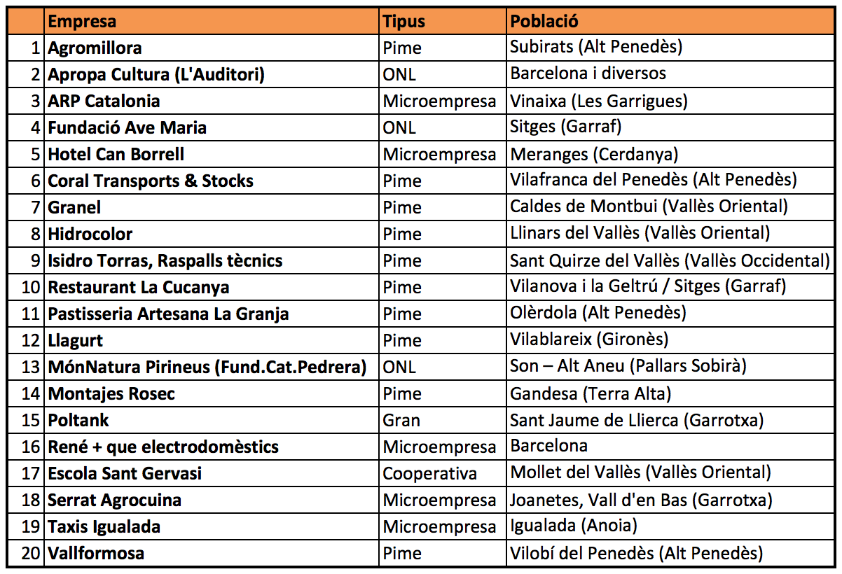 Les empreses reconegudes són: Agromillora, Apropa Cultura (L'Auditori), ARP Catalonia, Fundació Ave Maria, Hotel Can Borrell, Coral Transports & Stocks, Granel, Hidrocolor, Isidro Torras, Raspalls tècnics, Restaurant La Cucanya, Pastisseria Artesana La Granja, Llagurt, MónNatura Pirineus (Fund.Cat.Pedrera), Montajes Rosec, Poltank, René + que electrodomèstics, Escola Sant Gervasi, Serrat Agrocuina, Taxis Igualada, i Vallformosa.