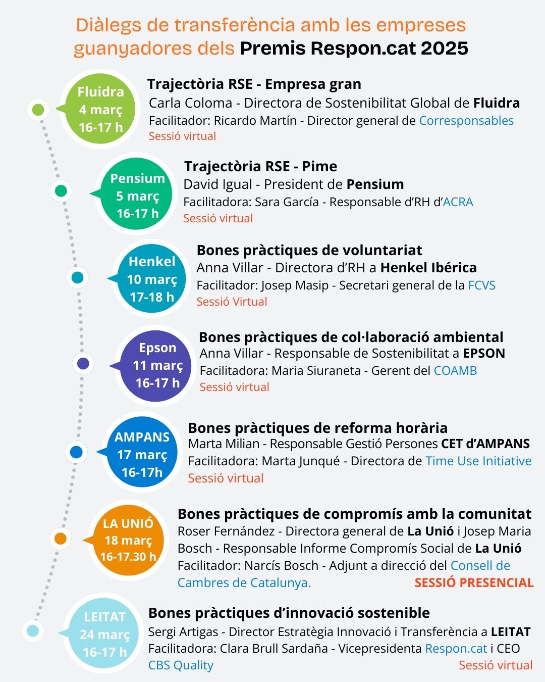 Com cada any, des de Respon.cat fem un seguit de diàlegs de transferència amb les empreses guanyadores dels premis Respon.cat, que aquest any 2025 van tenir lloc el passat 27 de gener. L’objectiu d’aquestes jornades és aprendre el valor generat gràcies a la Responsabilitat Social Empresarial (RSE) i allò que en retorna.