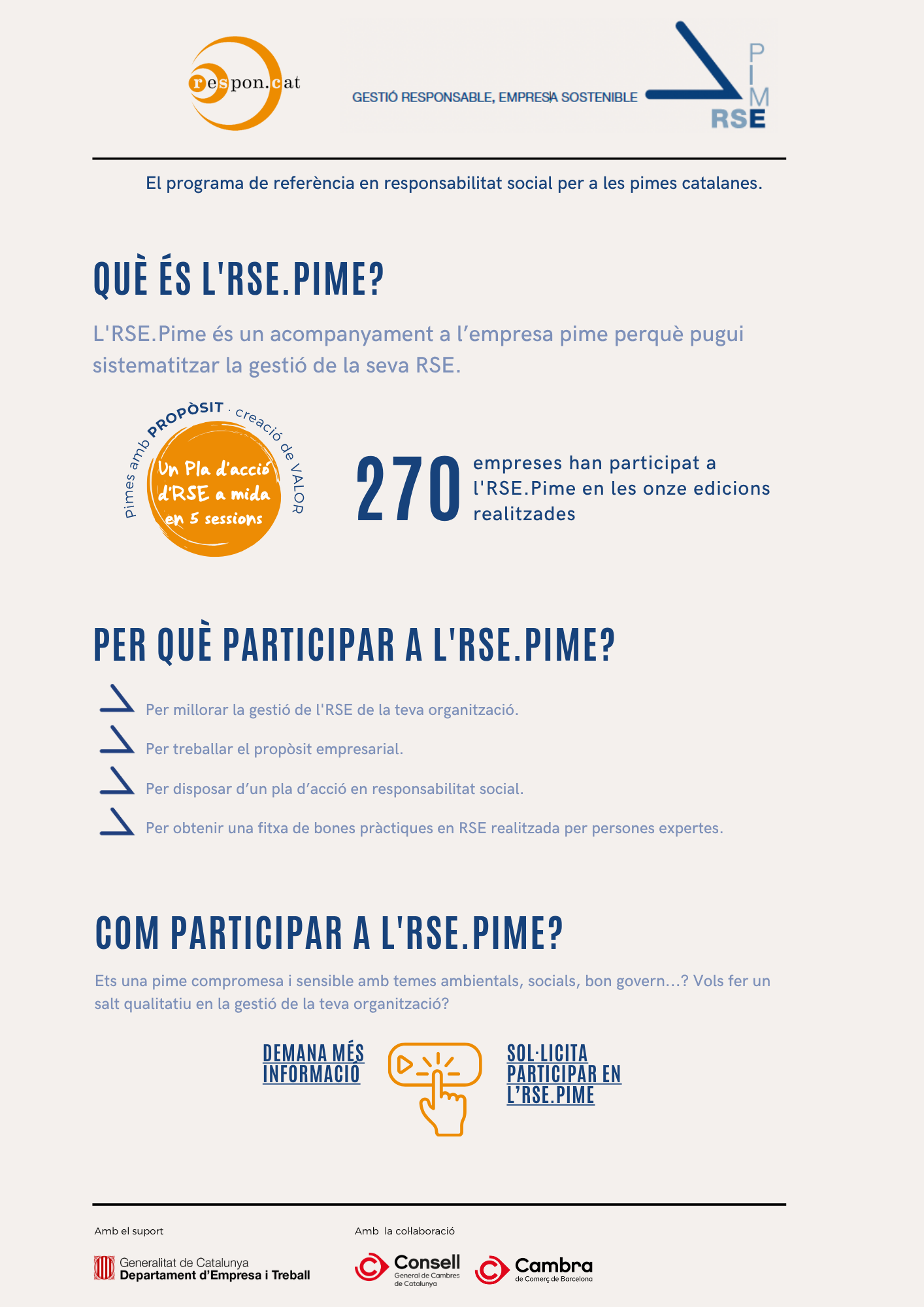 L'RSE.Pime l'organitza Respon.cat amb el suport del Departament d'Empresa i Treball de la Generalitat de Catalunya i la col·laboració del Consell General de Cambres de Catalunya, la Cambra de Comerç de Barcelona i el Palau Macaya.