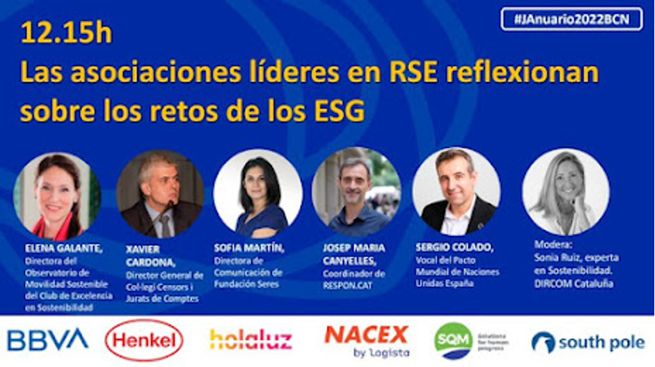 Josep Maria Canyelles, coordinador de Respon.cat, ha compartit la darrera de les taules, sobre els reptes dels ESG, amb: Elena Galante, directora de l’Observatori de Mobilitat Sostenible del Club d’Excel·lència en Sostenibilitat; Xavier Cardona, director general de Col·legi Censors i Jurats de Comptes; Sofía Martín, directora de Comunicació de Fundación Seres; i Sergio Colado, vocal del Pacte Mundial de les Nacions Unides Espanya, amb Sonia Ruiz, experta en Sostenibilitat de DIRCOM Catalunya com a moderadora.